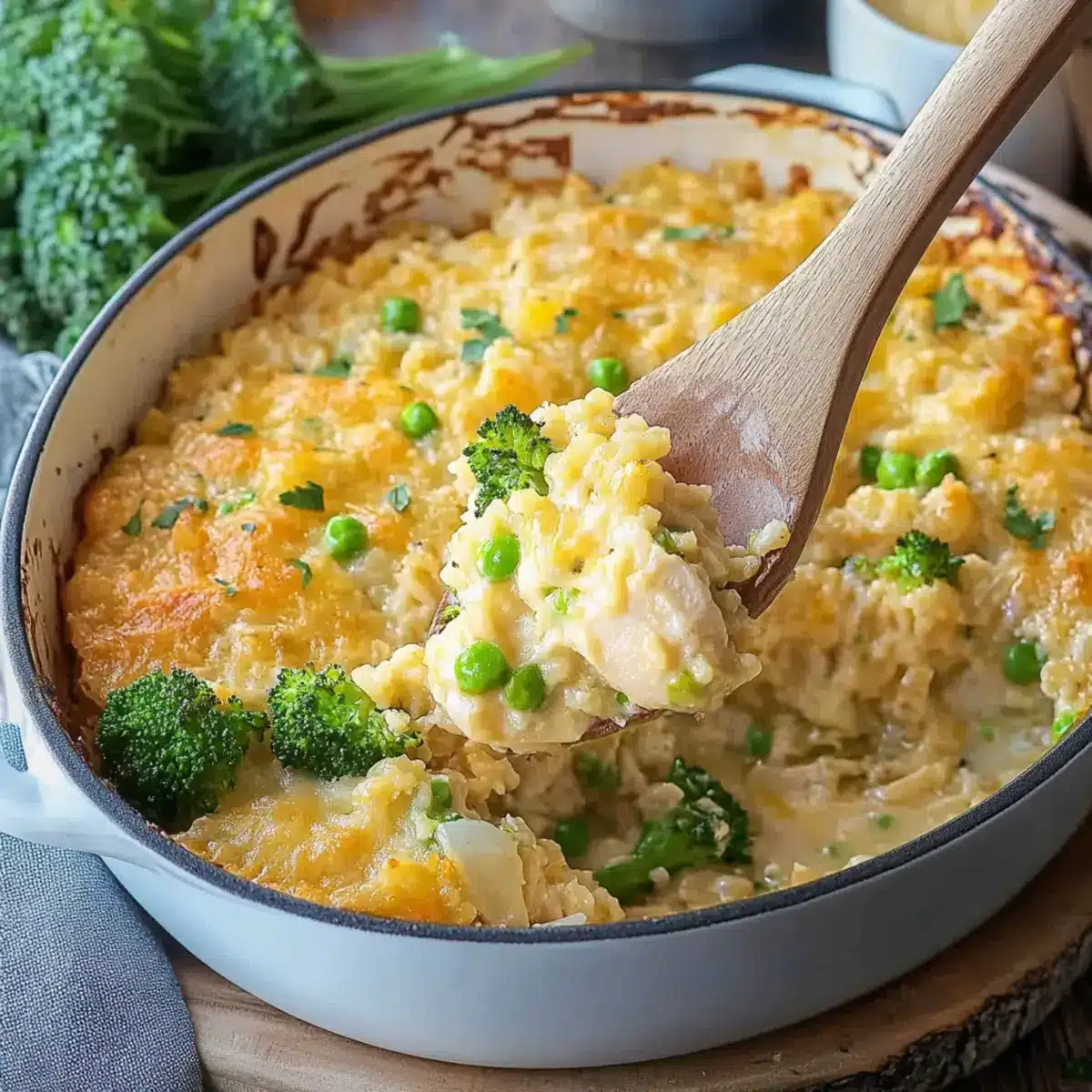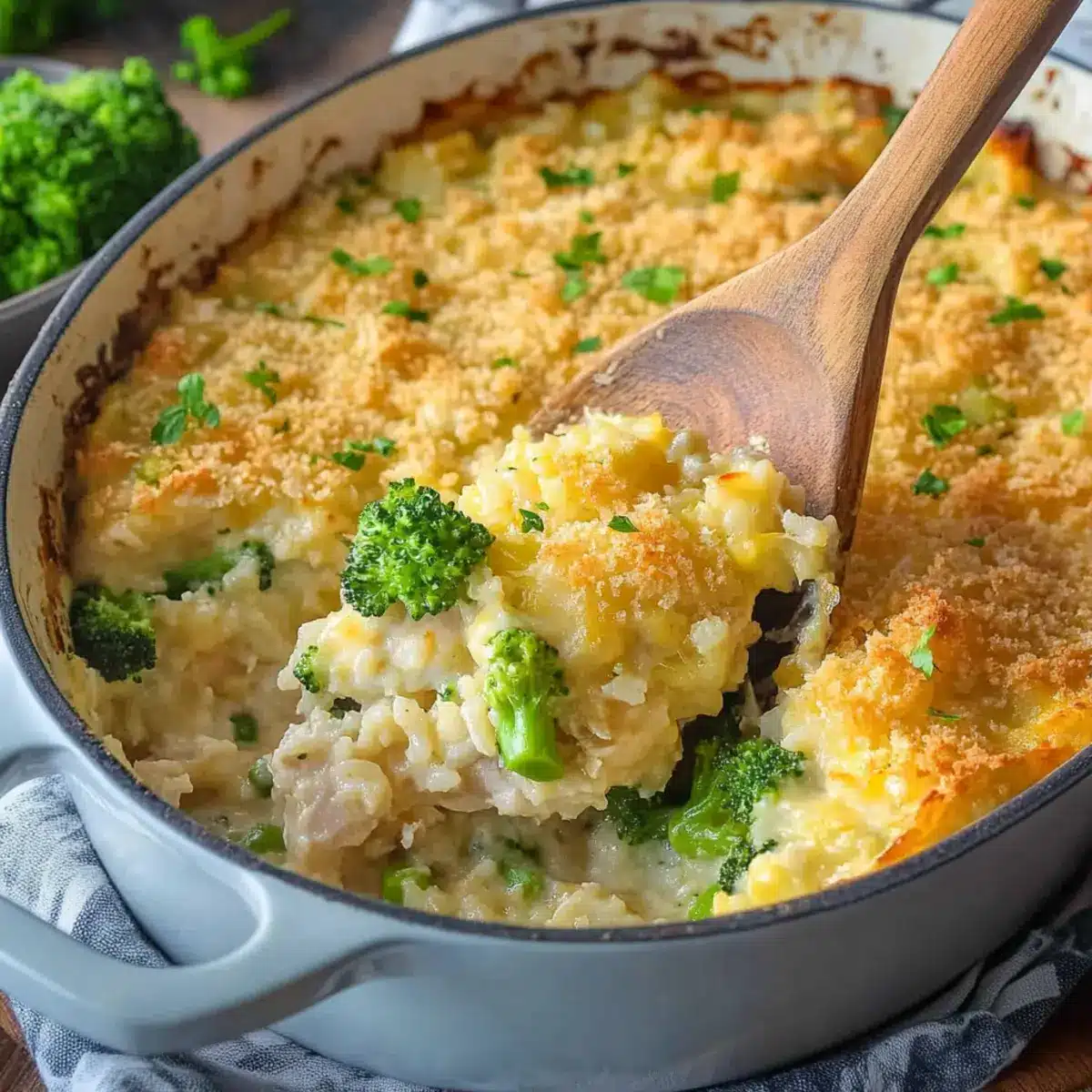 Comforting simplicity: This Chicken Broccoli Rice Casserole combines the ease of one-pan cooking with minimal cleanup, making it a weeknight favorite. Hearty and filling: Packed with tender chicken, fresh broccoli, and fluffy rice enveloped in a creamy, cheesy sauce, it satisfies even the pickiest eaters. Homemade goodness: Say goodbye to canned soupsโthis recipe focuses on fresh, wholesome ingredients that elevate your meal. Crowd-pleaser: Perfect for family dinners or gatherings, this dish invites everyone to dig in. Versatile options: Feel free to swap in your favorite veggies or cheeses to make it your own!