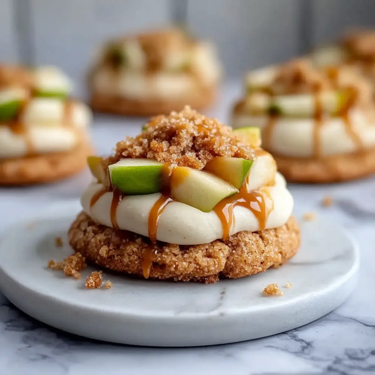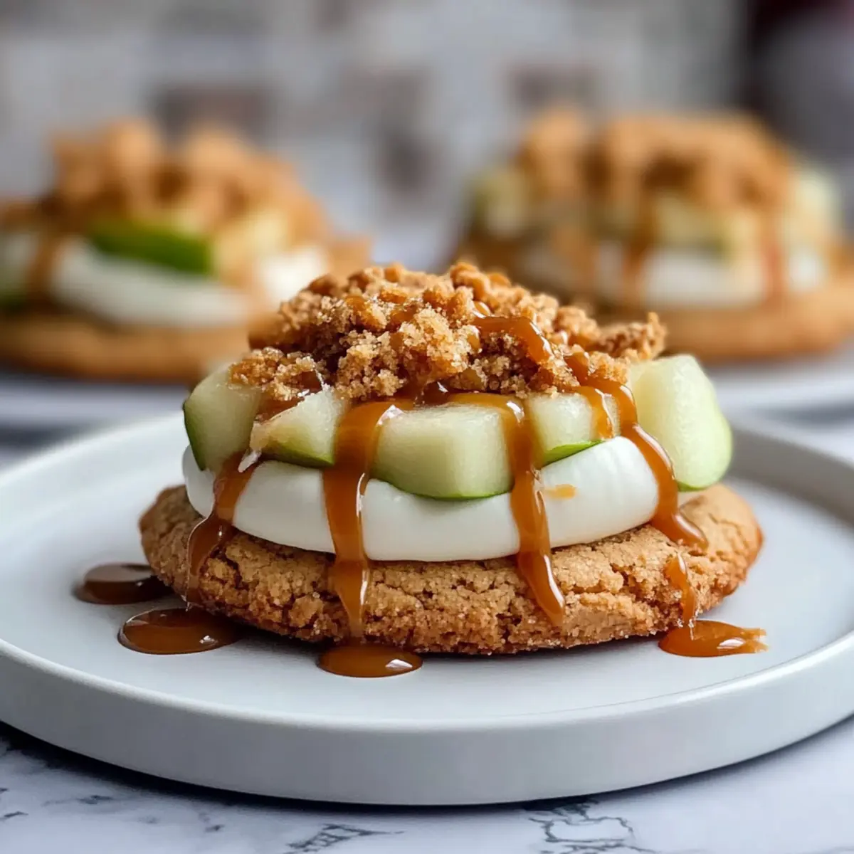 - Once the cookies are completely cooled, spread a generous layer of frosting on each cookie. Top with apple pieces, streusel, and a drizzle of caramel sauce.
