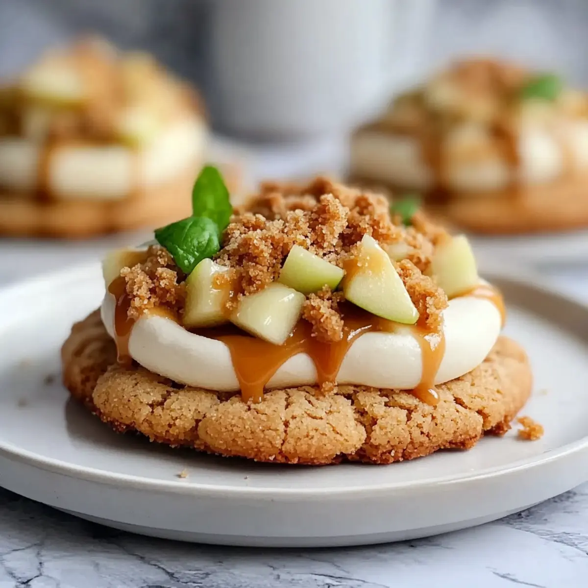 Frost Cookies: Once the cookies are completely cooled, spread a generous layer of frosting on top of each cookie. Finish by topping with apple pieces, streusel, and a drizzle of caramel sauce.
