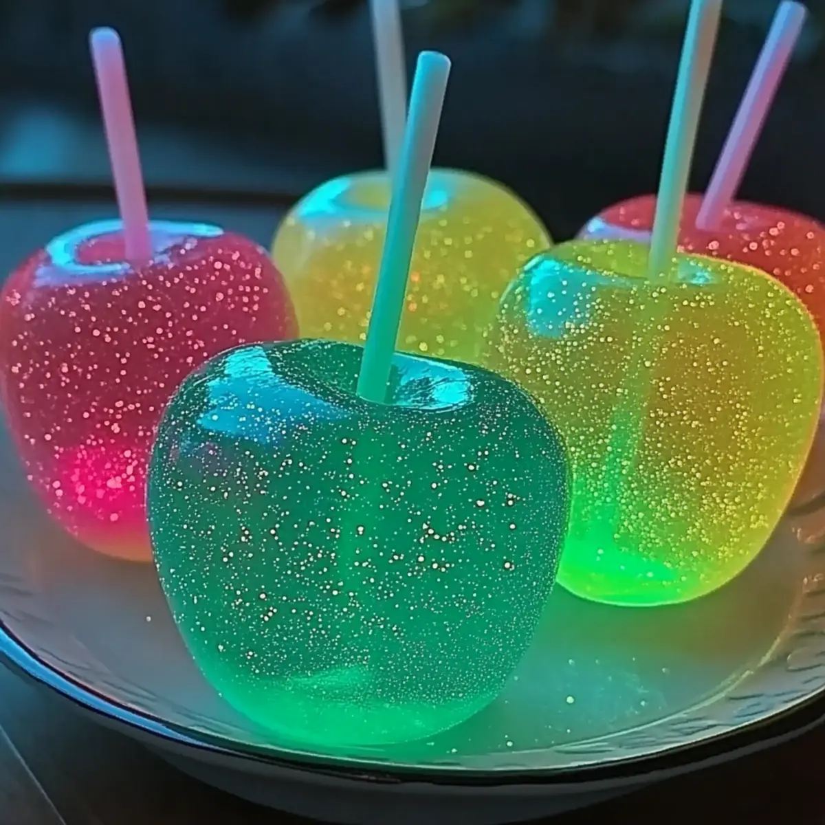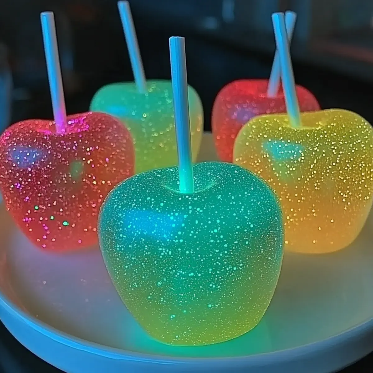 Delightful Creativity: These candy apples offer an unforgettable twist, glowing under black light for a party-ready centerpiece.