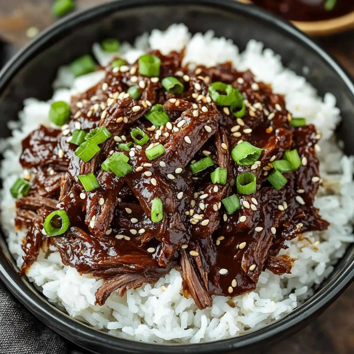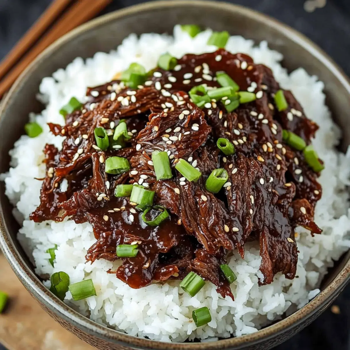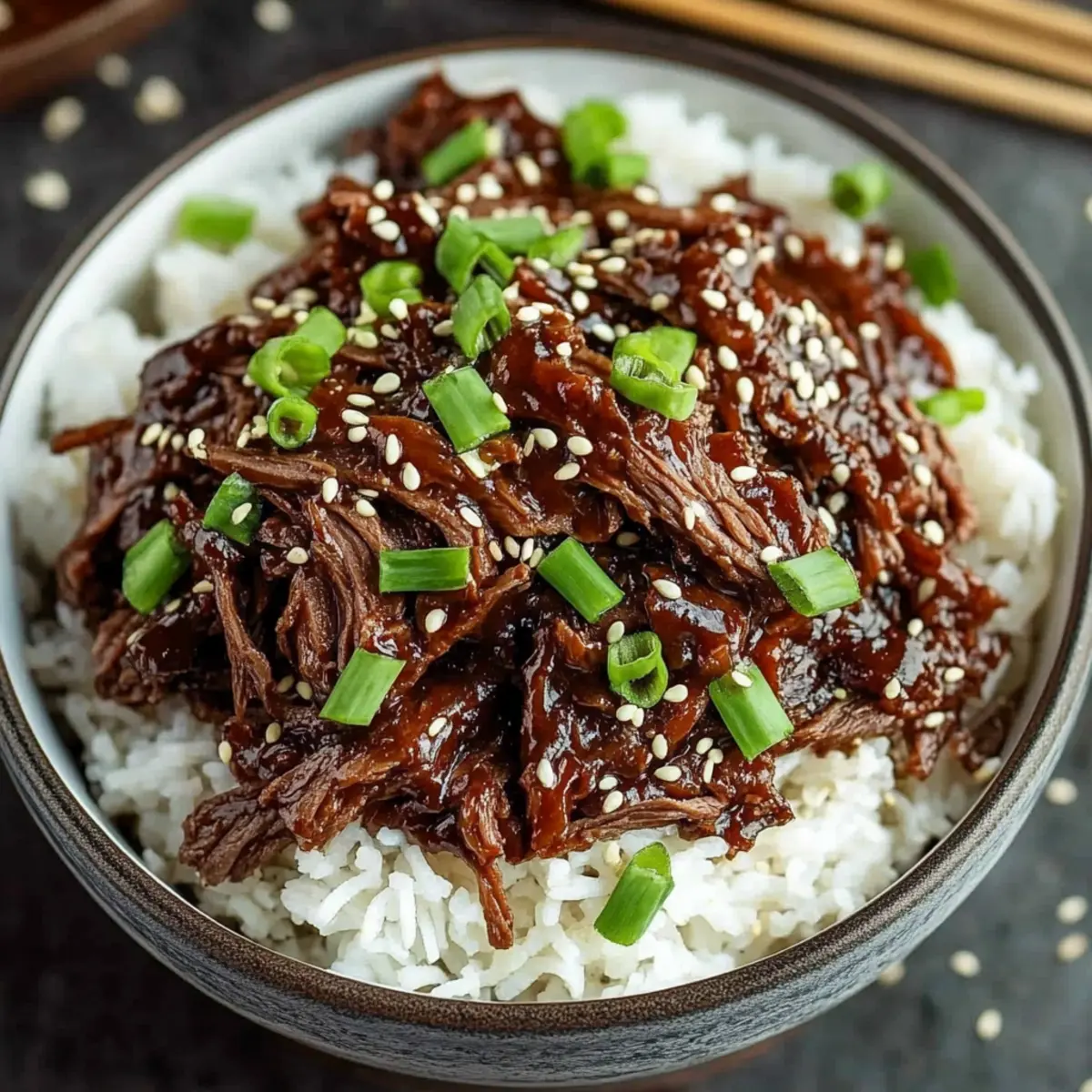 - Mix the shredded beef back into the sauce and simmer for 10-15 minutes. Serve over rice, garnished with green onions and sesame seeds.
