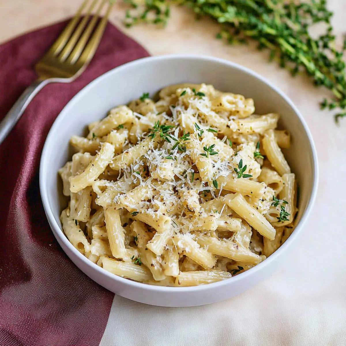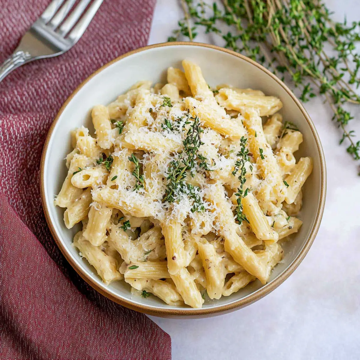 Mix in heavy cream and parmesan once the heat is turned off, removing the thyme sprigs. You’ll create a creamy texture that perfectly envelops the pasta.